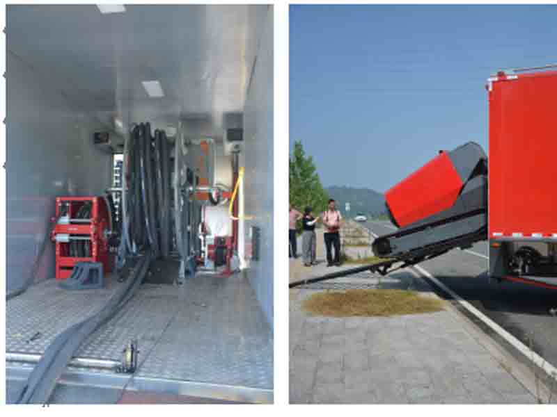 移動排水泵站及液壓系統(tǒng)放置室:車廂中段用于停放液壓裝置、液壓油箱及放置油管絞盤。車廂后門為下開式,行車時作為后門,保護車內設施,當子車下車時,可作為其階梯,使子車平穩(wěn)上下車。